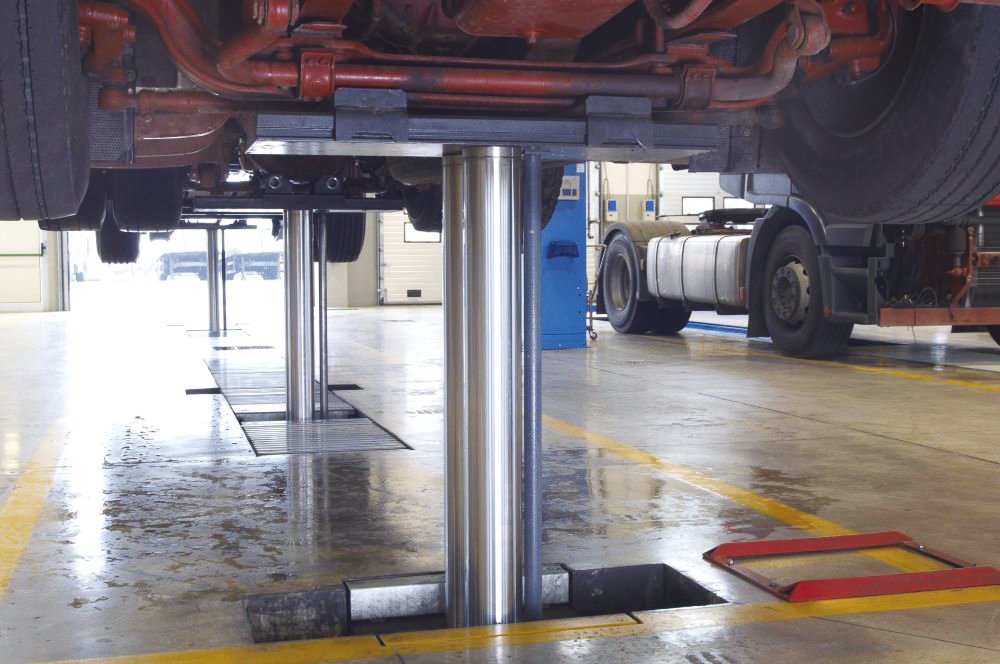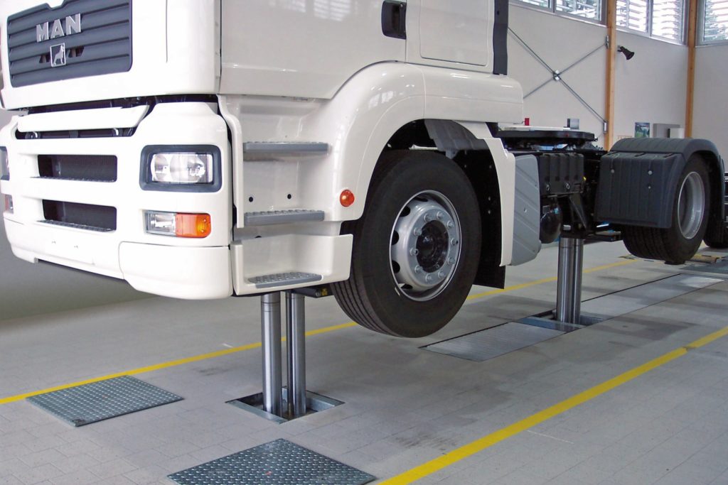 TRUCKLIFT | Multi-Post Lifting System three lifting units with S cover Description: Robust, hard chrome-plated lifting posts with high bending strength Torsion protection due to double cylinders Corrosion-resistant hydraulic piston, because it plunges into the hydraulic oil with every stroke Medium-pressure hydraulic unit installed in a space-saving manner directly on the lifting units Very quiet…