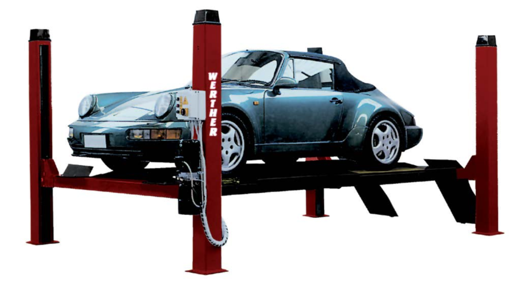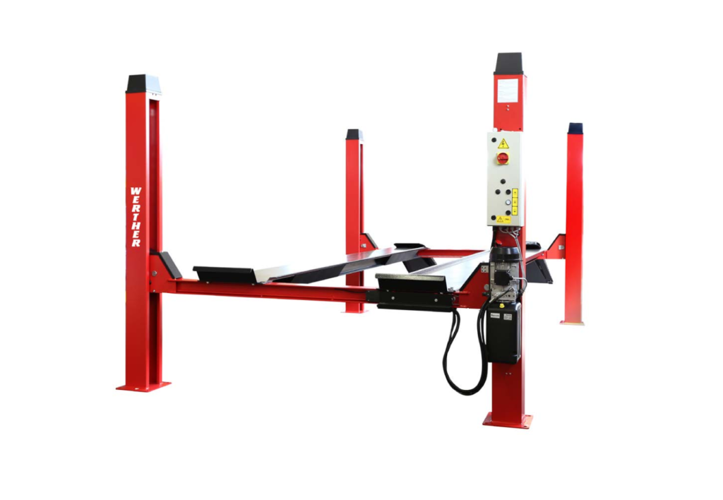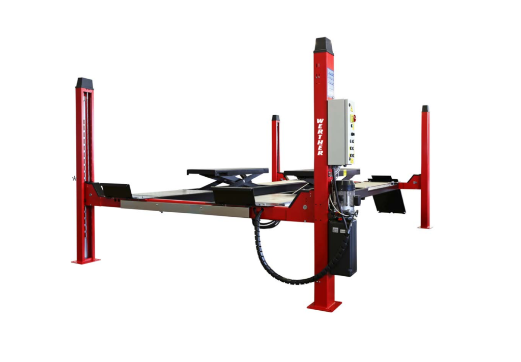 Electro-hydraulic 4 post lift with front recesses and rear slip plates for wheel alignment Overload safety valve • Descent control valve • “Buzzer” on last portion of descent • Pipe burst safety valve • 24 V, low tension dead man controls • Automatic release of safety locking devices Manufacturer’s website: Werther Product website: Werther –…