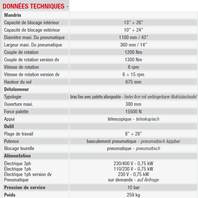 The standard chuck on the machine features a patented system that allows to work on all types of wheels from 10″ to 24″ by being able to move the working range from 10″- 20″ to 14″- 24″ by a simple action of the operator. Its shape has been designed to guarantee to the user, who works on large wheel diameters, an easier and quicker positioning of the wheel during beading and, above all, to keep the overall dimensions of the plate on the machine to a minimum. Height from the floor of the self-centring plate of 675 mm.