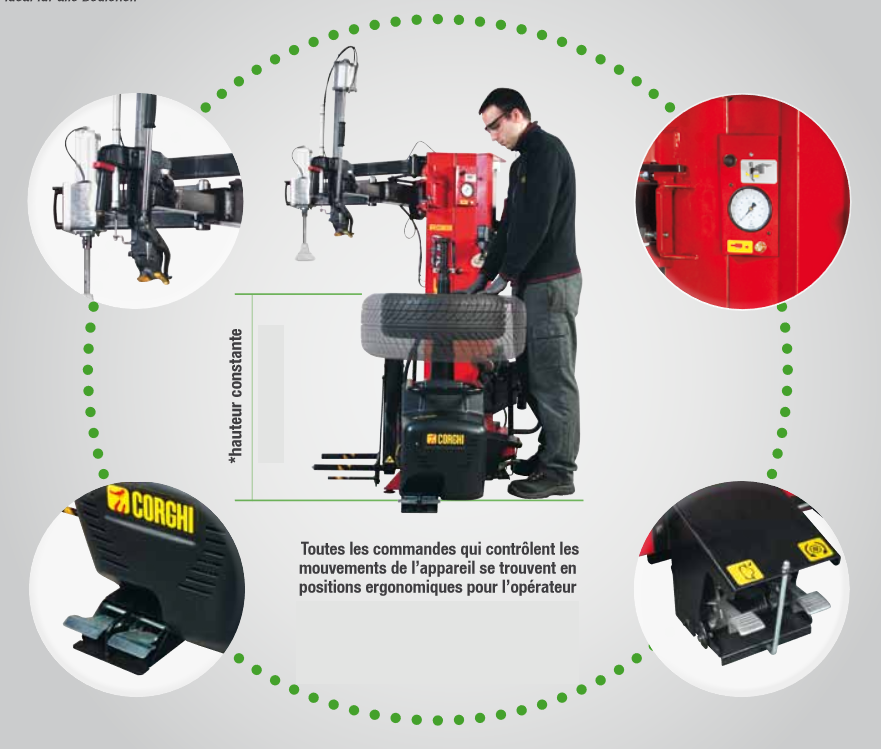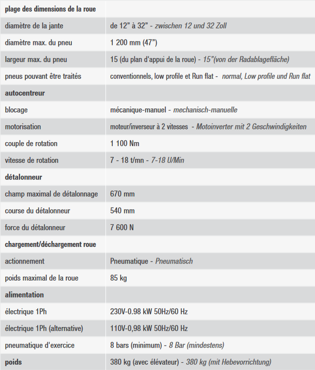 Many technical innovations: dynamic bead breaking device with a dual bead breaker disc, newly designed head group, more performing wheel support plate clamping, reinforced structure, great attention to ergonomics and control availability.