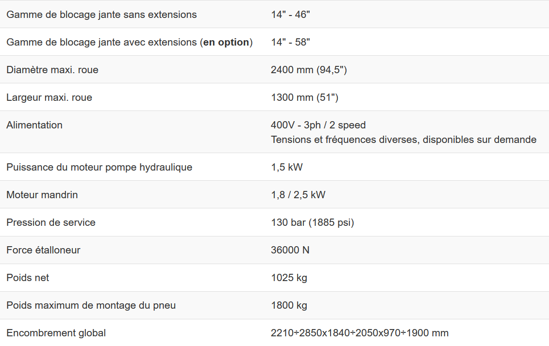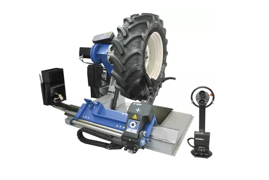 Tyre changing machine suitable for truck, bus and agriculture tyres with 14" - 58"(1) rim (max. wheel diameter 2400 mm./94,5", max. wheel width 1300 mm./ 51"), equipped with two-speed hydraulic clamping chuck, tool holder arm carriage with automatic movement, automatic tool rotation and mobile control unit for safe and convenient operation.