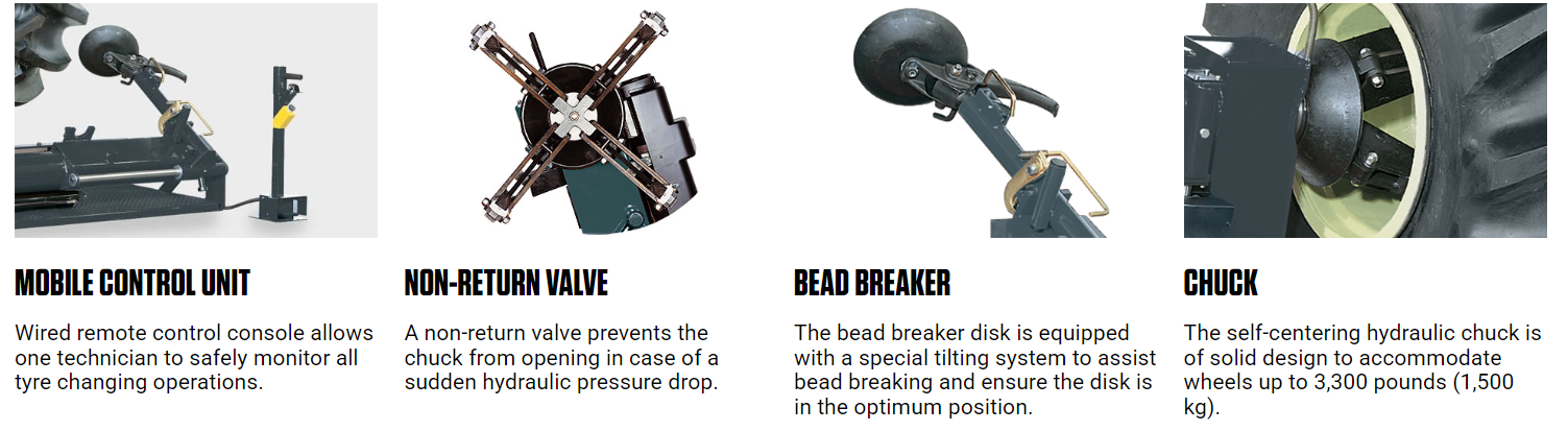 Utilising a remote-control console, the John Bean T8056 allows a single technician to work on tyres and OTR wheel assemblies up to 92.5 inches in maximum diameter; clamping wheels of 32 inches diameter (or 56 with optional extensions), safely and easily. The two-speed, self-centring, four-jaw, hydraulically operated chuck grips wheels with authority. We’ve designed the T8056 with an all-in-one bead breaker, mount/demount head assembly that makes quick work of even the toughest tyres. For heavy-duty wheels and tyres this is the ultimate in productivity, safety, and precision.