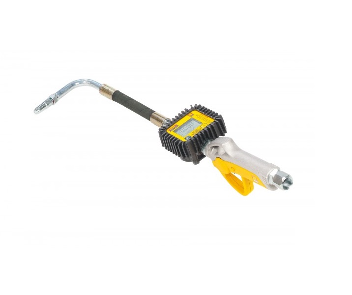 Oil dispensing gun with PRE-SELECTED or manual delivery. The user can calibrate it according to different units of measurement (litres, gallons, pints). It is supplied calibrated in litres, but can be easily calibrated by the user.