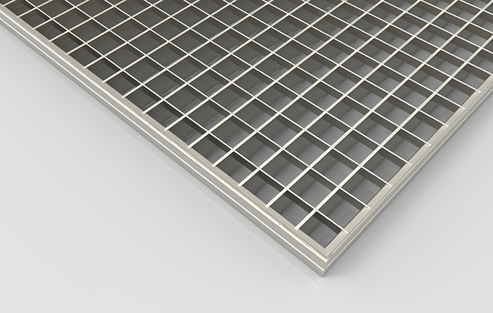 Pressed gratings are sturdy grids of bearing bars and crossbars made from steel strip. The sizes are extremely precise thanks to our sophisticated, computerised production process that also ensures the accurate coiling, straightening, punching and cutting of strip steel. The crossbars are automatically pressed into the bearing bars and enclosed by an edge, guaranteeing a rigid panel. As standard the V-edge is used, but it is also possible to choose a flat edge or T-profile edge.