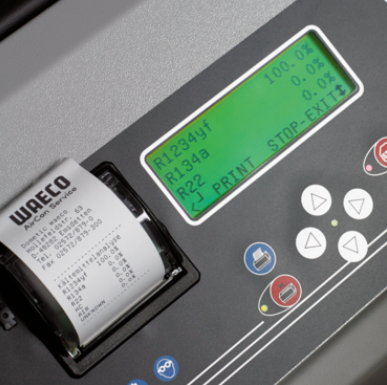 Fully automatic service unit for R1234yf A/C systems with integrated charging amount database, practical display, heated charging cylinder, printer, patented oil and UV-dye charging system and more. Convenient software update via USB port.