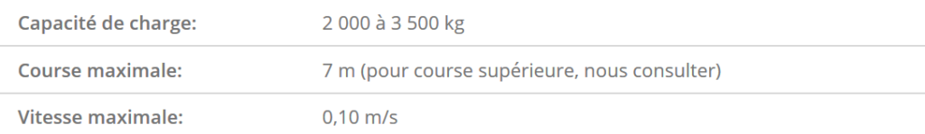 En effet, la présence de deux vérins symétriques permet de supporter une charge jusqu’à 3500 kg, et une largeur de cabine pouvant aller jusqu’à 3 mètres.