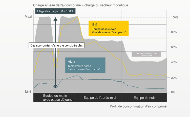 Avec la baisse des températures en hiver, la puissance demandée aux sécheurs frigorifiques diminue également (courbe turquoise). Pour que le point de rosée reste stable malgré toutes ces fluctuations, il faut dimensionner les sécheurs frigorifiques pour la charge de pointe et avec une marge suffisante.