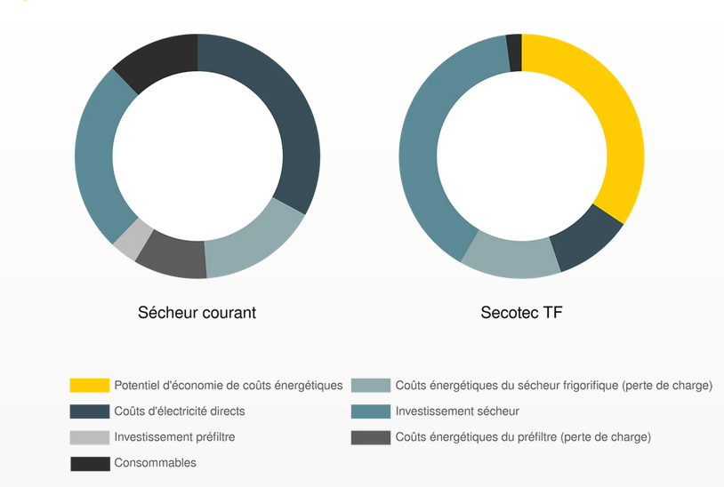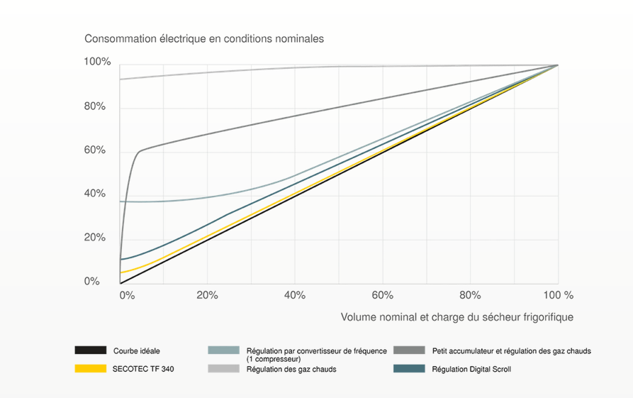 Elle permet ainsi aux sécheurs frigorifiques SECOTEC d’économiser près de 60 % des frais d’électricité pour un taux d’utilisation moyen de 40 %, par rapport aux sécheurs frigorifiques à régulation des gaz chauds par exemple.