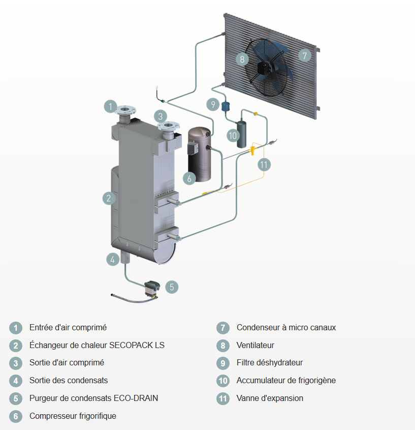 À la différence des systèmes conventionnels, la puissance frigorifique excédentaire n’est pas gaspillée. Elle est utilisée pour refroidir la masse thermique qui fournit le froid pour le séchage de l’air comprimé. Aucune dépense d’énergie électrique n’est donc nécessaire.